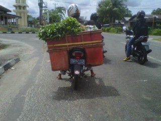 Pedagang ini melintasi Jalan Sudirman Tanjungpandan membawa sayurnya ke desa-desa. Pemasok sayuran dari perkebunan sayur biasa memasok sayur ke pasar-pasar di Tanjungpandan.