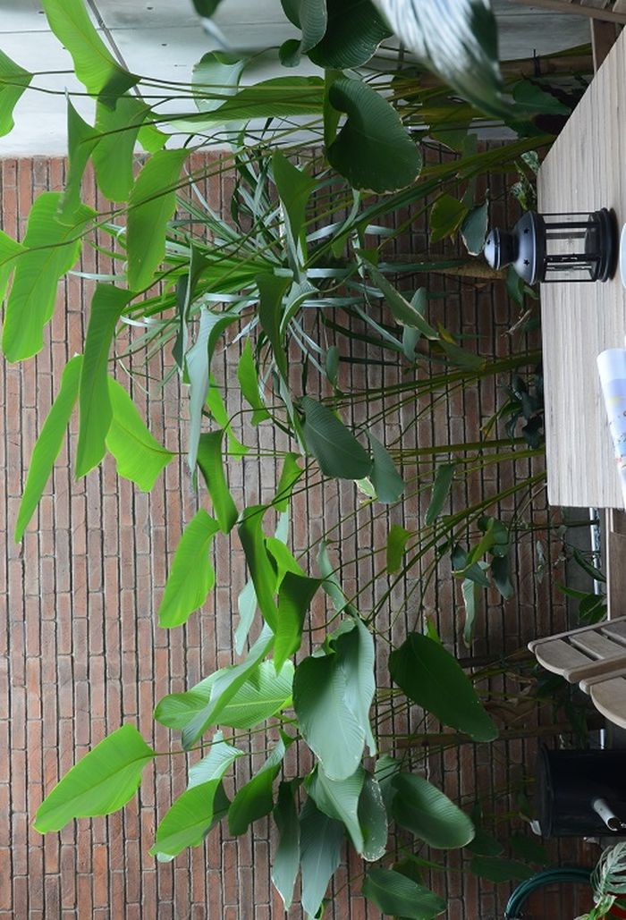 Bata merah yang diekspos mempertegas kesan tropis pada taman ini.