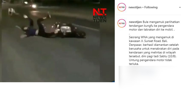 "Bule mengamuk perlihatkan tendangan kungfu ke pengendara motor dan tabrakan diri ke mobil. .