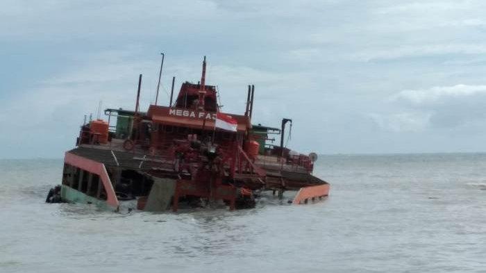 Oni, warga setempat mengungkapkan KIP Mega Fajar ini mengalami putus tali jangkar akibat hantaman gelombang air laut besar sekitar pukul 02.30 WIB.
