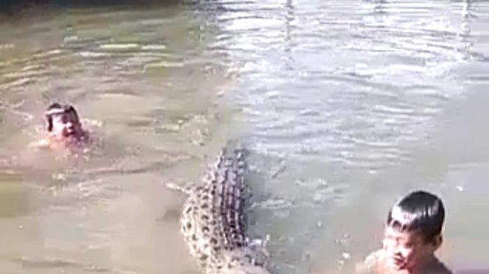 Kehadiran buaya bersama anak-anak yang sedang mandi di sungai membuat warga geger.