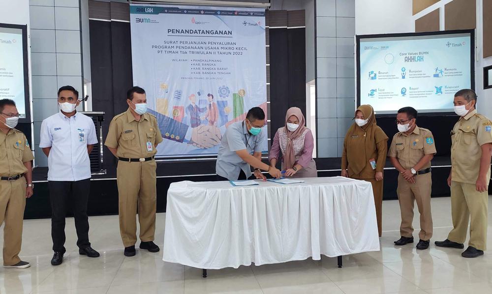 BANGKAPOS.COM, BANGKA - Puluhan pelaku Usaha Mikro Kecil (UMK) di kota/kabupaten di Bangka Belitung menerima bantuan pendanaan yang disalurkan PT Timah Tbk di Gedung Graha Timah, Senin (20/6/2022).