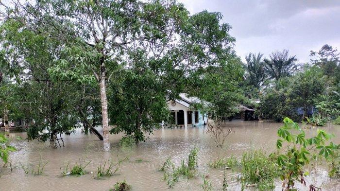Hujan deras yang mengakibatkan banjir di Kawasan RT 03 RW 02 Desa Cerucuk, Kecamatan Badau, Kabupaten Belitung