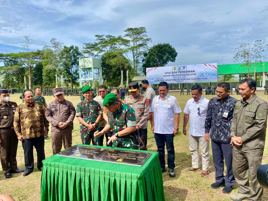 BANGKAPOS.COM, BANGKA -- Penandatangan prasasti oleh Panglima Kodam (Pangdam) II/Sriwijaya , Mayjen TNI Hilman Hadi menjadi penanda peresmian Kodim 0432/Bangka Selatan dan Batalyon Infanteri (Yonif) 147/Ksatria Garuda Jaya (KGJ).