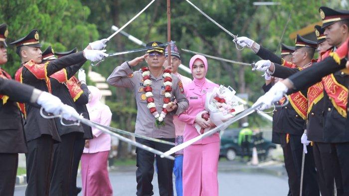 Didampingi istri Taufik Noor Isya kemudian melewati barisan pedang pora yang dibawakan oleh para perwira pertama di jajaran Polres Bangka.