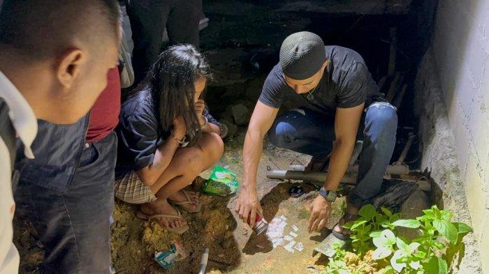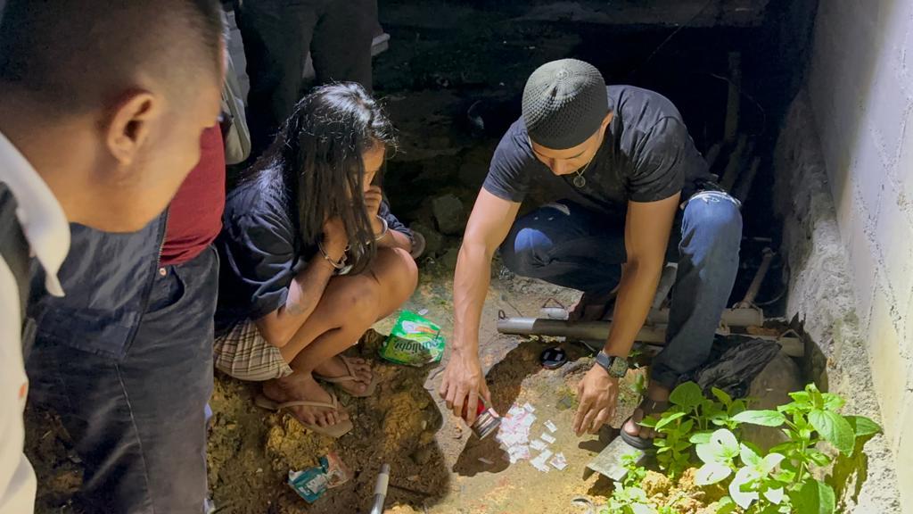 Saat itu didapati keduanya sedang berada di dalam kontrakan. Disaksikan oleh Ketua RT setempat kemudian dilakukan penggeledahan. Saat berada di samping kontrakan ditemukan kantong plastik yang dicek ternyata terdapat kaleng yang di dalamnya terdapat 44 paket hemat sabu.