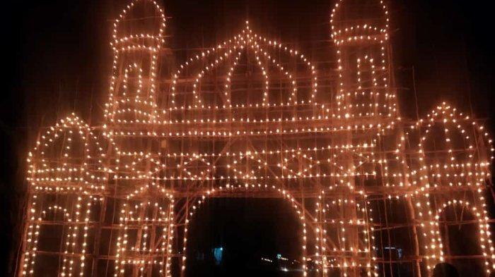 Enam gerbang api tujuh likur yang berbentuk banguna Masjid dan kaligrafi menghiasi sepanjang Jalan Raya Kayu Arang, Desa Mancung.