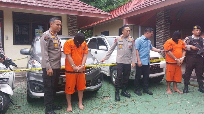 Kedua tersangka dalam kasus itu, langsung ditampilkan di depan awak media, dengan menggunakan penutup muka dan berpakaian oranye.