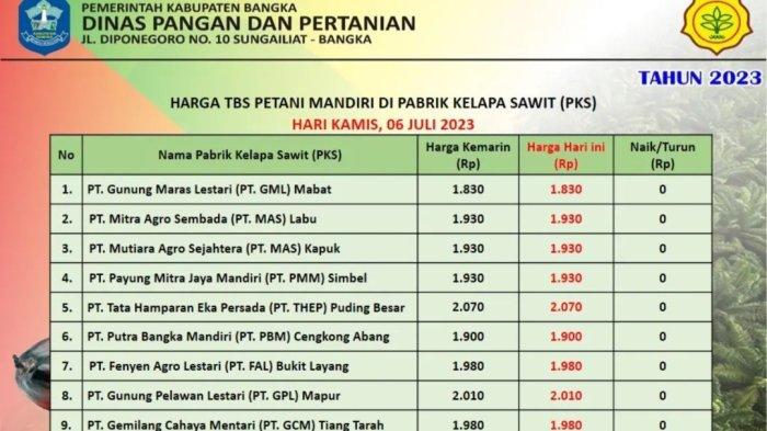 BANGKAPOS.COM, BANGKA -- Harga Tandan Buah Segar (TBS) kelapa sawit di Kabupaten Bangka Kamis (6/7/2023) tidak mengalami perubahan sama seperti harga kemarin.