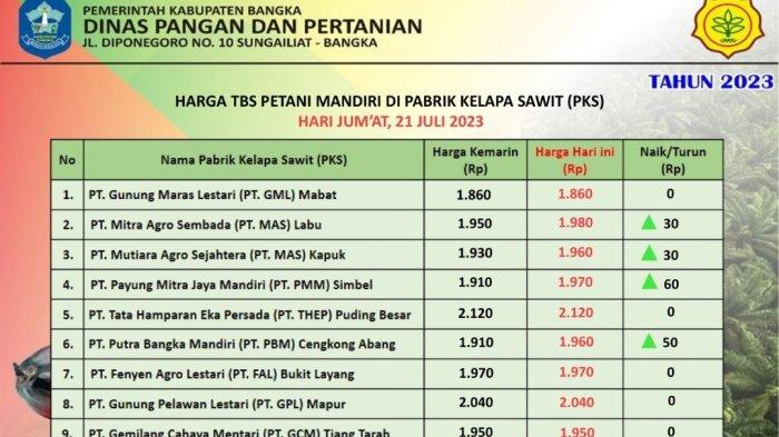 Daftar harga beli TBS di 9 perusahaan sawit di Kabupaten Bangka Jum'at (21/7/2023).