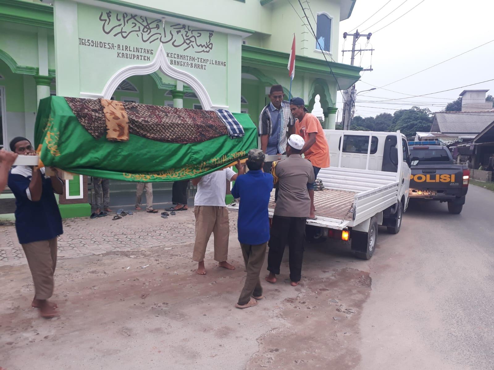 Kapolsek Tempilang Iptu Intan Diputra bersama personel Polsek menyerahkan jenazah ke pihak keluarga.