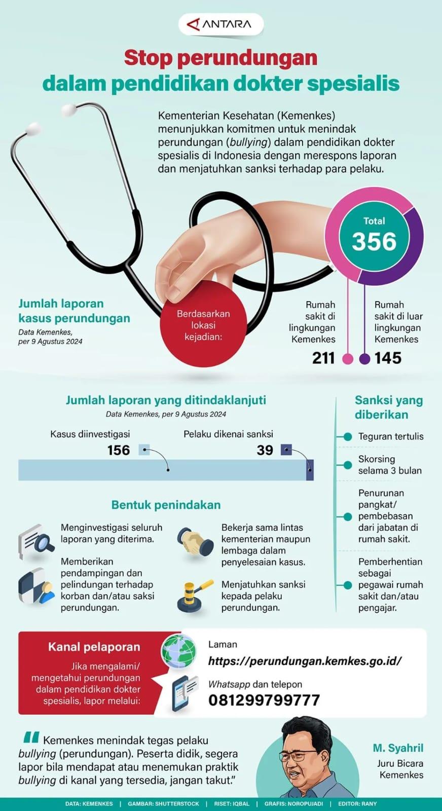 Kementerian Kesehatan (Kemenkes) menunjukkan komitmen untuk menindak perundungan (bullying) dalam pendidikan dokter spesialis di Indonesia dengan merespons laporan dan menjatuhkan sanksi terhadap para pelaku.
