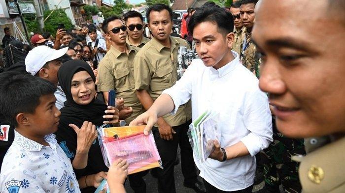 Dalam kunjungannya itu, Gibran membagikan susu, buku, dan peralatan sekolah kepada siswa-siswa yang berbaris menyambutnya di sepanjang jalan protokol
